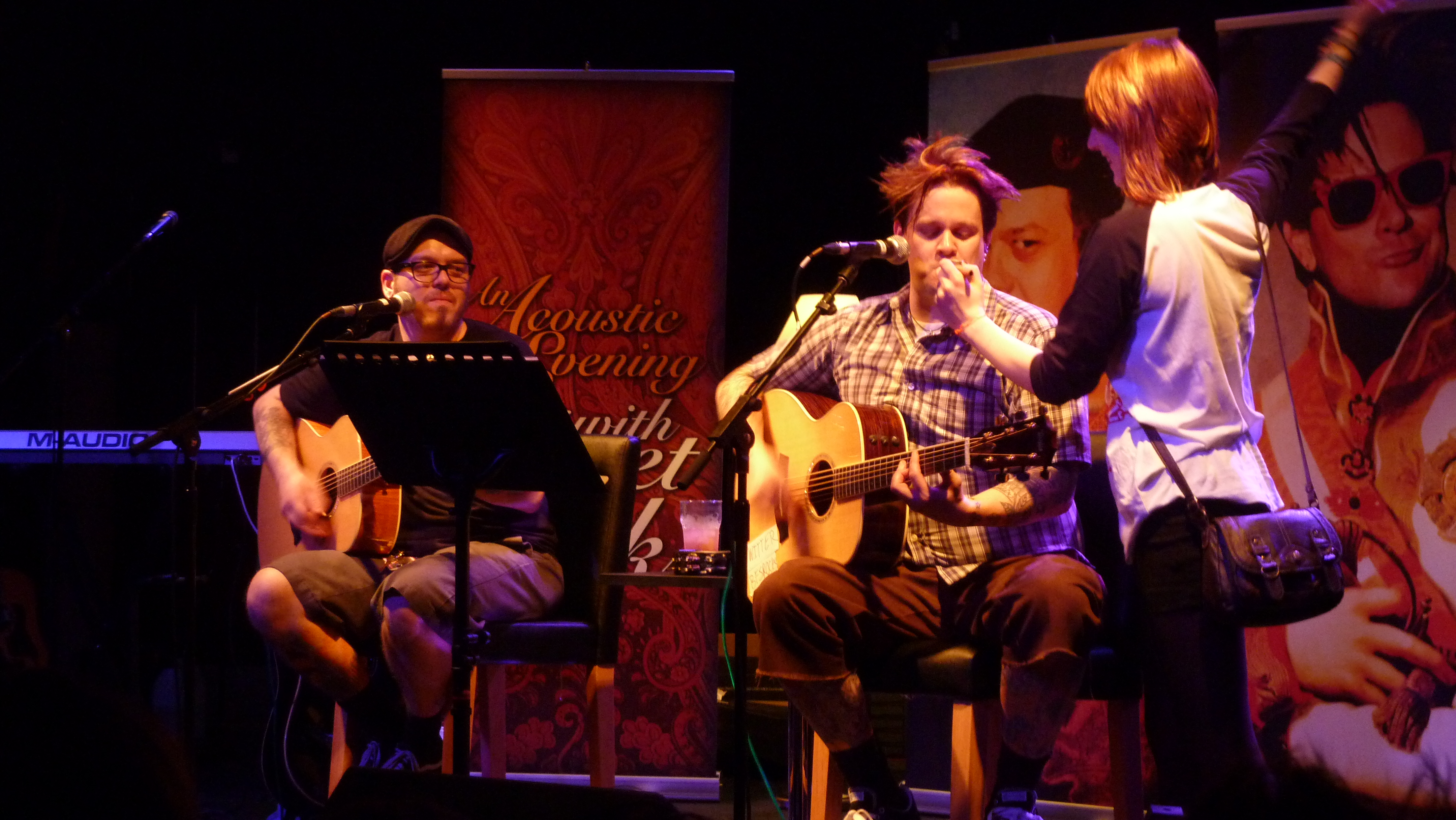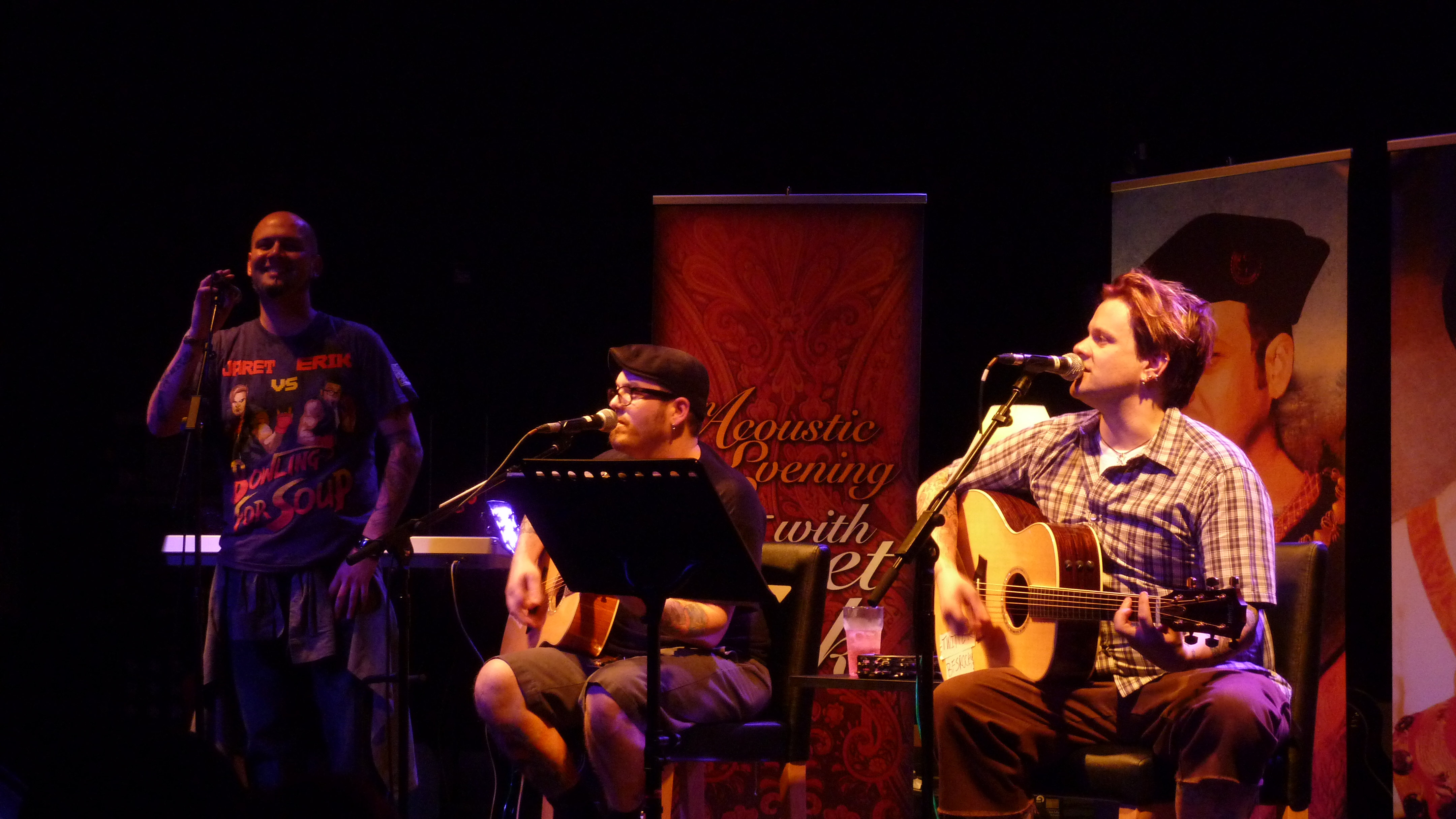 Regardless of how many beverages had been consumed, it didn’t affect them one bit as there was a killer singalong to “Almost” to kick things off with fellow BFS favourite Emily and Star Song. The Bitch Song was next up, but slightly modified to “Still A Bitch” in honour of another of Erik Chandler’s ex girlfriends (poor guy had most of his romantic history discussed during the course of this one show). The “no setlist policy” of Bowling For Soup live shows is always great, but even more so in the acoustic environment as sometimes when the audience would shout out songs the guys would play them (such as when someone asked for the Phineas and Ferb theme song), and other times they’d tell us to not tell them what to do. At the same time, they’d flick through the song book and suggest songs to each other, half the time one of them would shoot the other one down, or agree to it despite not being sure at all about playing it!