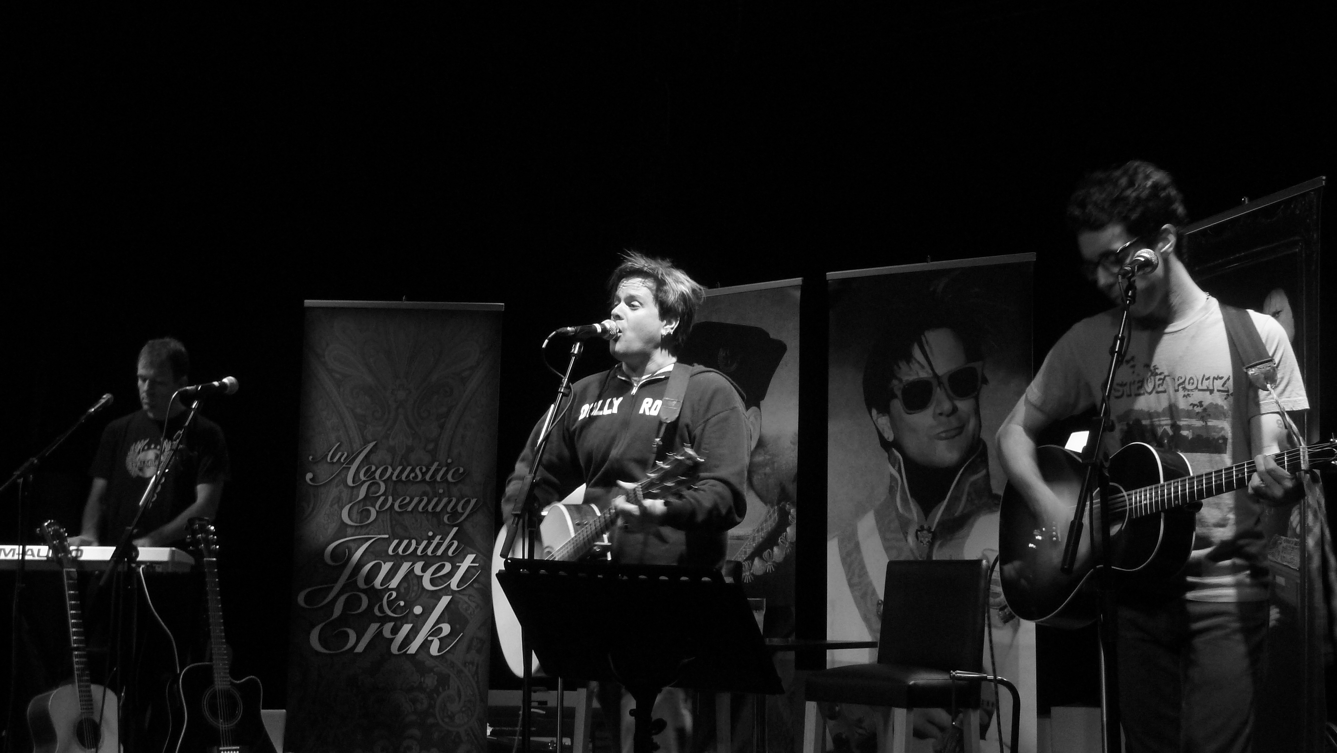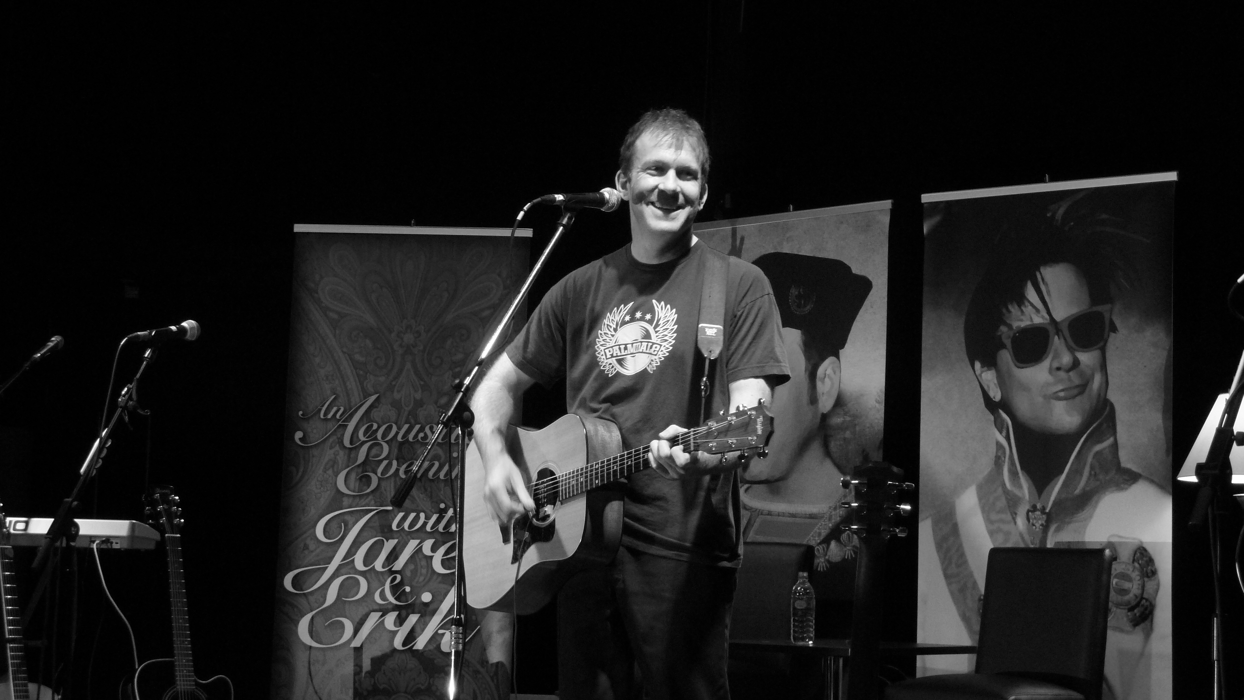 Last time out, Jaret and Erik were on stage for nearly three hours for a combination of music, comedy, drinking and general merriment. They wouldn’t have quite so long this time but as we all know its about quality over quantity (and its always great when you get both, which you always do with BFS). After a short interval after Linus’s set, Jaret and Erik returned to their living room set from last time complete with some fantastic added artwork (Jaret bearing a remarkable likeness to Charlie Sheen in one such portrait). They were both well lubricated with pink beverages (“I’ve had 7 of these already” was one of Jaret’s first announcements) so Erik was playing catch up from the outset as the guys engaged in some traditional audience banter about american pronounciations of British expressions from the word go.