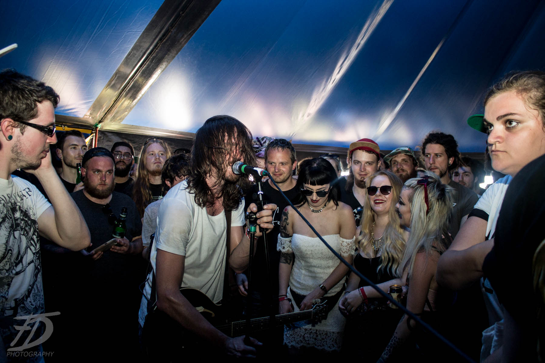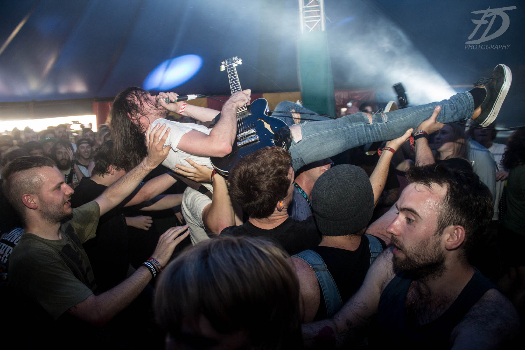 Back on the third stage it was time for Heck (9) to cause some chaos. Despite recently having a name change there is very little else that has changed about this band. They are still one of the most insane and exciting live bands on the planet. The band don’t even make it through a single song before a member is on top of the crowd and this doesn’t stop for the rest of the set. Amps and mic stands end up in the crowd whilst “Powerboat Disaster” sees vocalist and guitarists Matt and Jonny battling each other whilst on fans shoulders. Heck once again prove why they are one of the best live bands around and with a debut album out soon, Heck are filling their set with more great songs to go along with all the insanity.