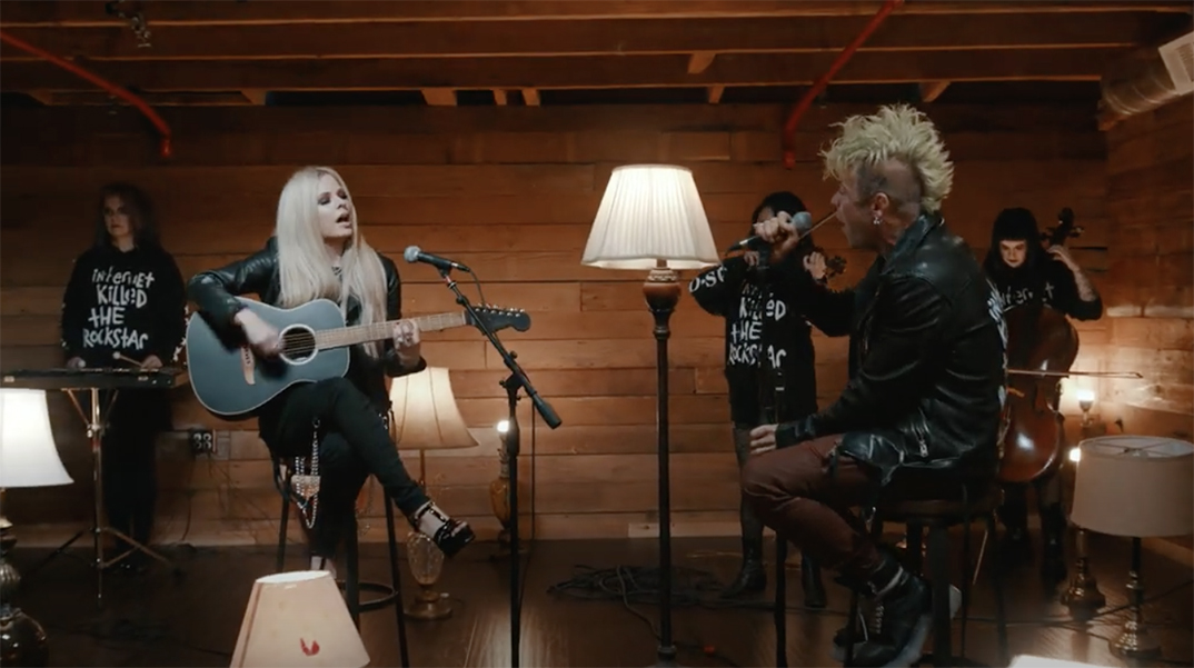 The video sees Lavigne and Derek Ryan Smith (MOD SUN) performing the track surrounded by various lit lamps (as opposed to burning flames, as seen in the video for the original track) with a string section playing in the background, adorning Internet Killed The Rockstar apparel (a nod to the title of MOD SUN’s latest album of which Flames is featured on).